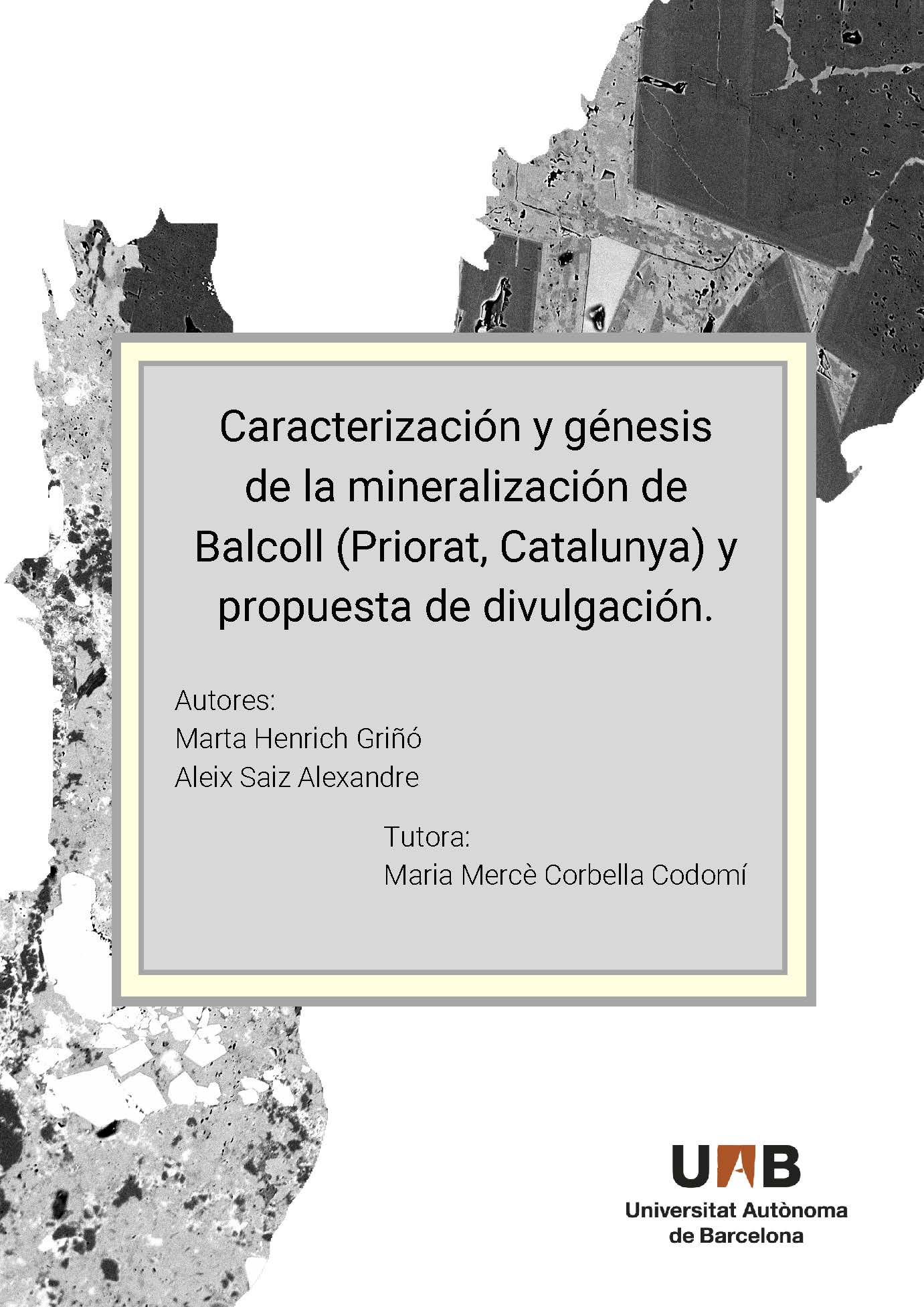 Marta y Aleix, con el incondicional apoyo de Mercè Corbella Cordomí realizamos el Trabajo de Fin de grado en la Universidad Autónoma de Barcelona titulado: "Caracterización y génesis de la mineralización de Balcoll (Priorat, Catalunya) y propuesta de divulgación". Ambos hemos estudiado el doble grado de Ciencias Ambientales y Geología con lo que hemos aprendido a observar y conocer el mundo desde una visión crítica e interdisciplinar. En este estudio se ha caracterizado la composición y paragénesis de la mina Balcoll, que forma parte de la cuenca minera del Priorat, con microscopia petrográfica y electrónica mediante muestras de la escombrera y de la colección. En la mina se explotaron tres filones que contenían plata. Además, se ha realizado una propuesta de divulgación científica dirigida a un público no especializado mediante la interpretación de planos antiguos de la mina, desde los cuales, se ha elaborado una maqueta y un modelo 3D donde se representan las galerías y los filones de la mineralización deducidos, con el soporte de un póster divulgativo.